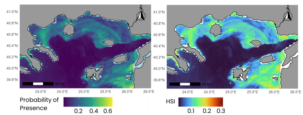 Figure 1Anchovy (E. encrasicolus) Probability of Presence (left) HSI model output (right) for July 2019.